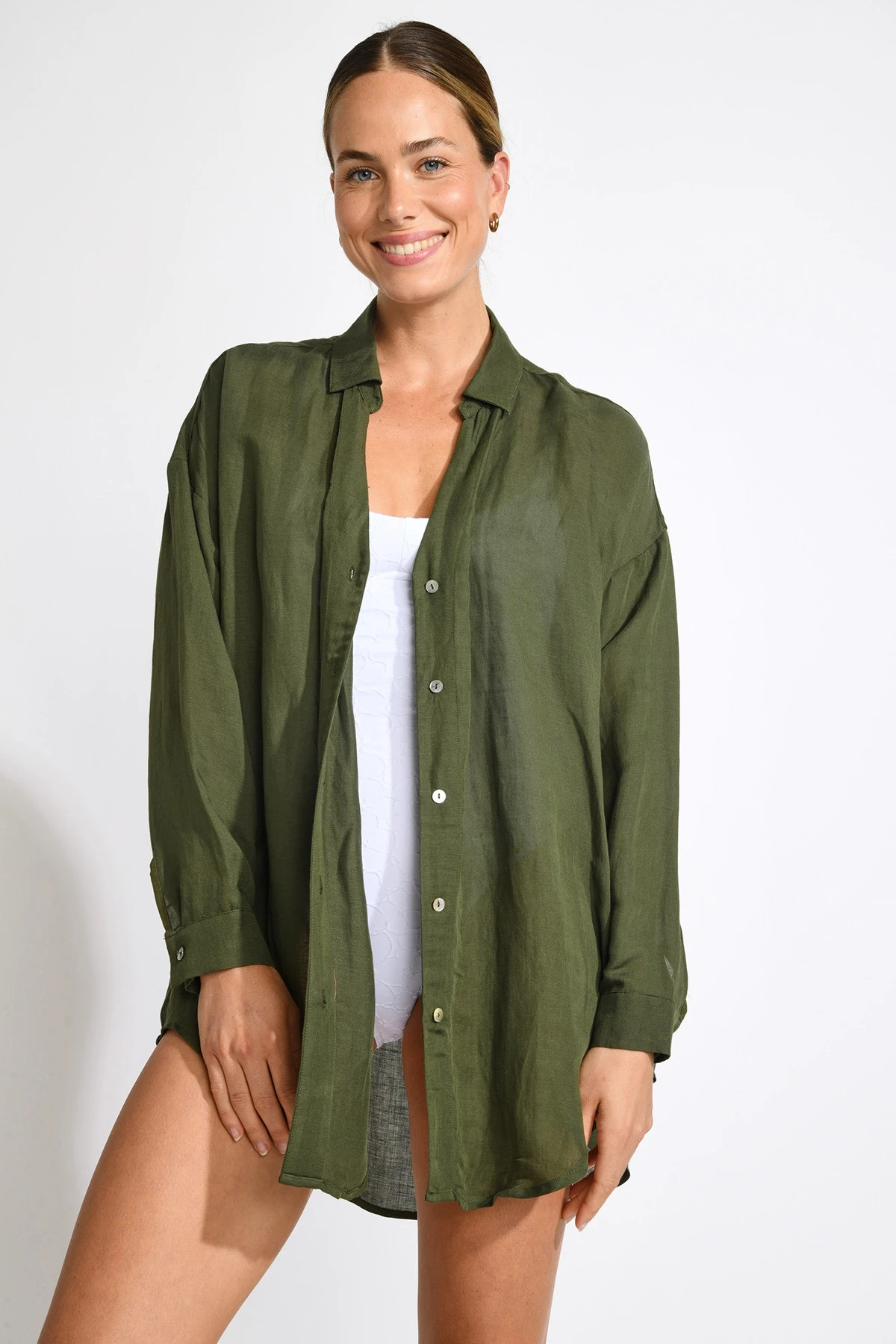 Chemise kaki ALAGOA AMANDINE : cette chemise longue et fluide à boutonner allie élégance et confort. Son design intemporel et sa coupe légère en font un incontournable pour votre garde-robe. Parfaite pour une tenue décontractée ou plus habillée, elle se marie aisément avec vos pièces préférées