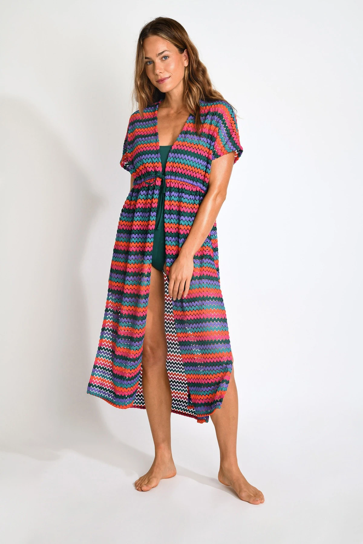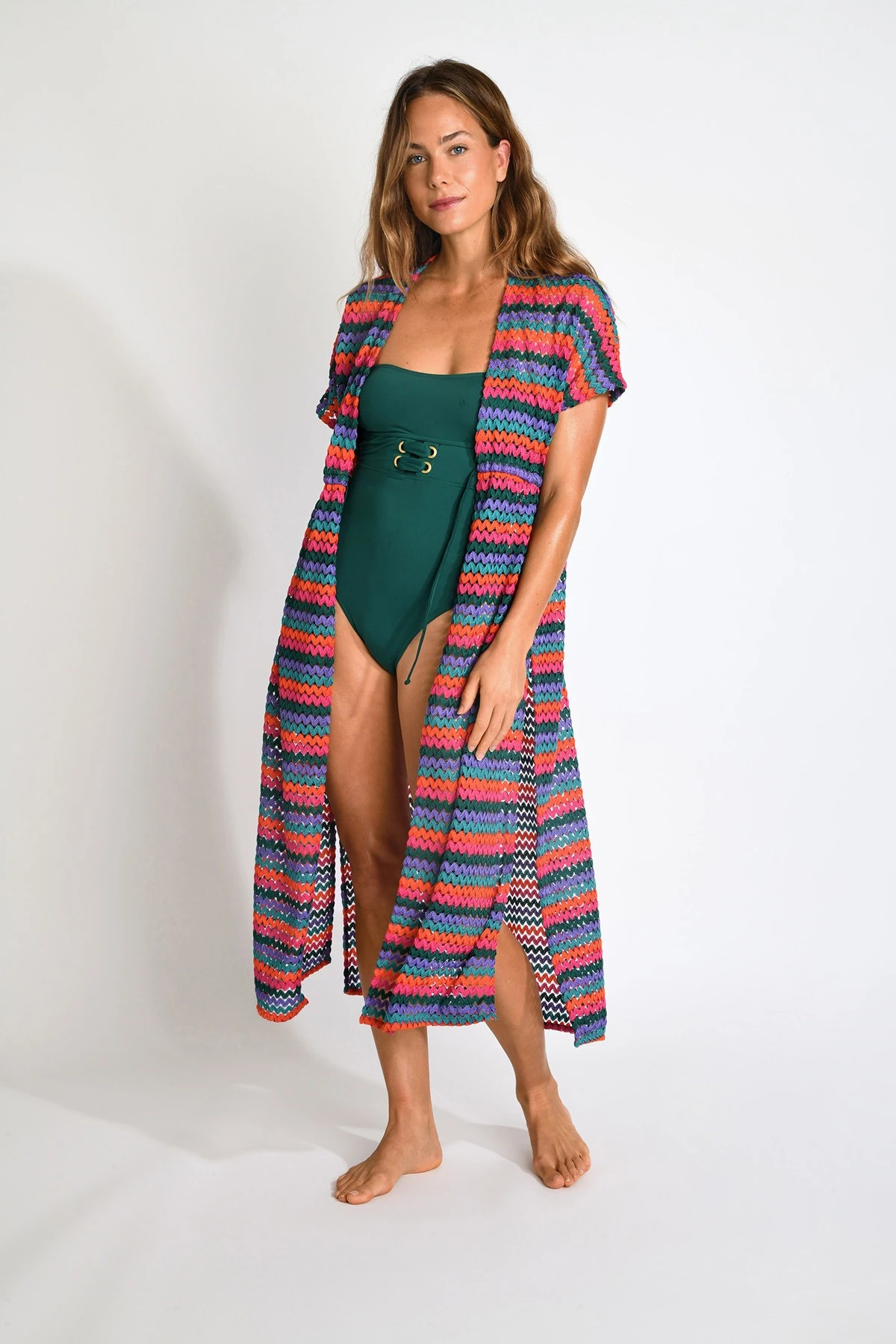 Ce kimono rose de la collection LIZAE FIGUERAL séduit par sa coupe longue et fluide, idéale pour un look élégant et décontracté. Doté d’un cordon pour ajuster et souligner la taille, il s’adapte parfaitement à votre silhouette. Avec ses manches courtes et ses touches colorées, il apporte une note de fraîcheur et de légèreté à votre style.